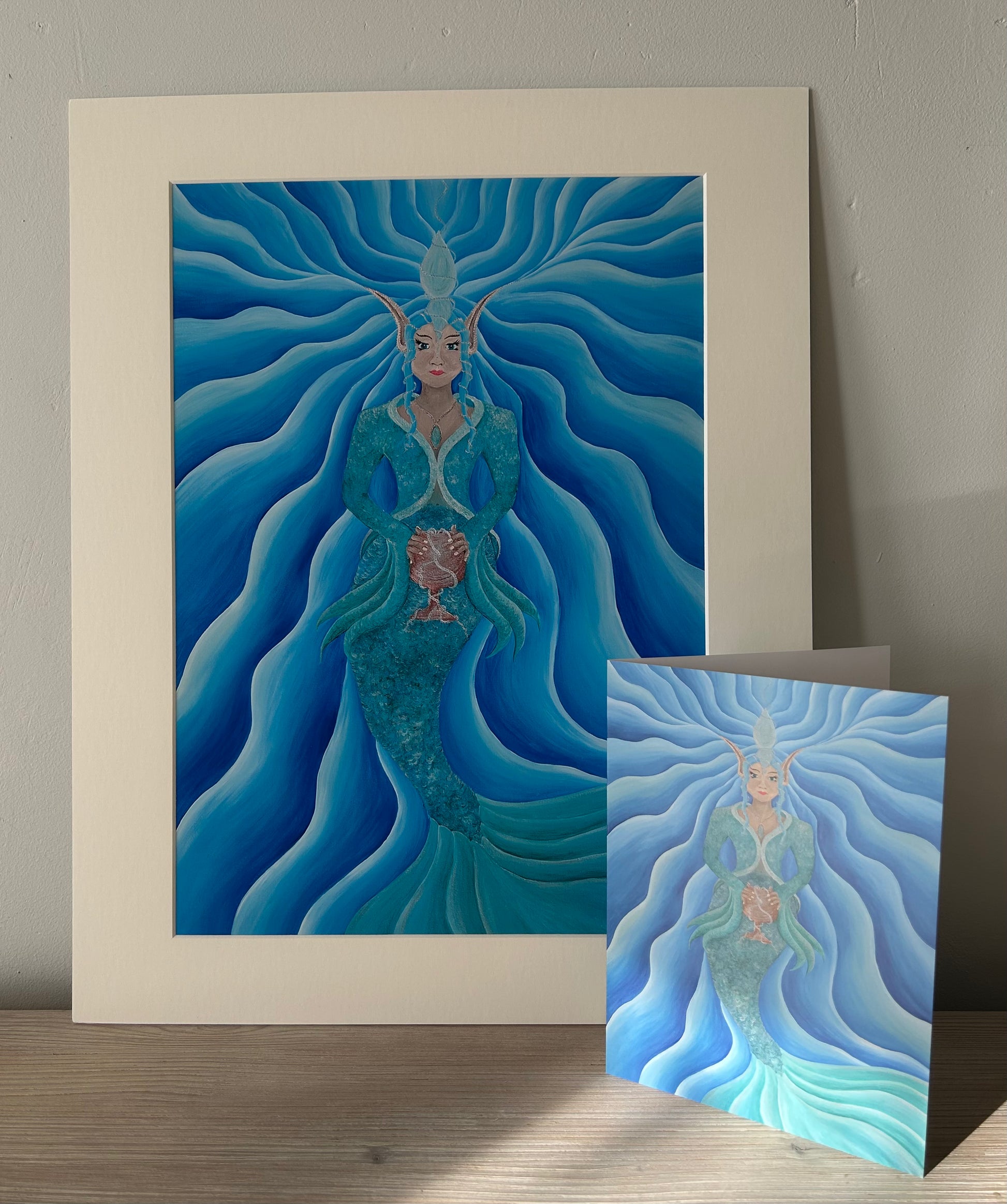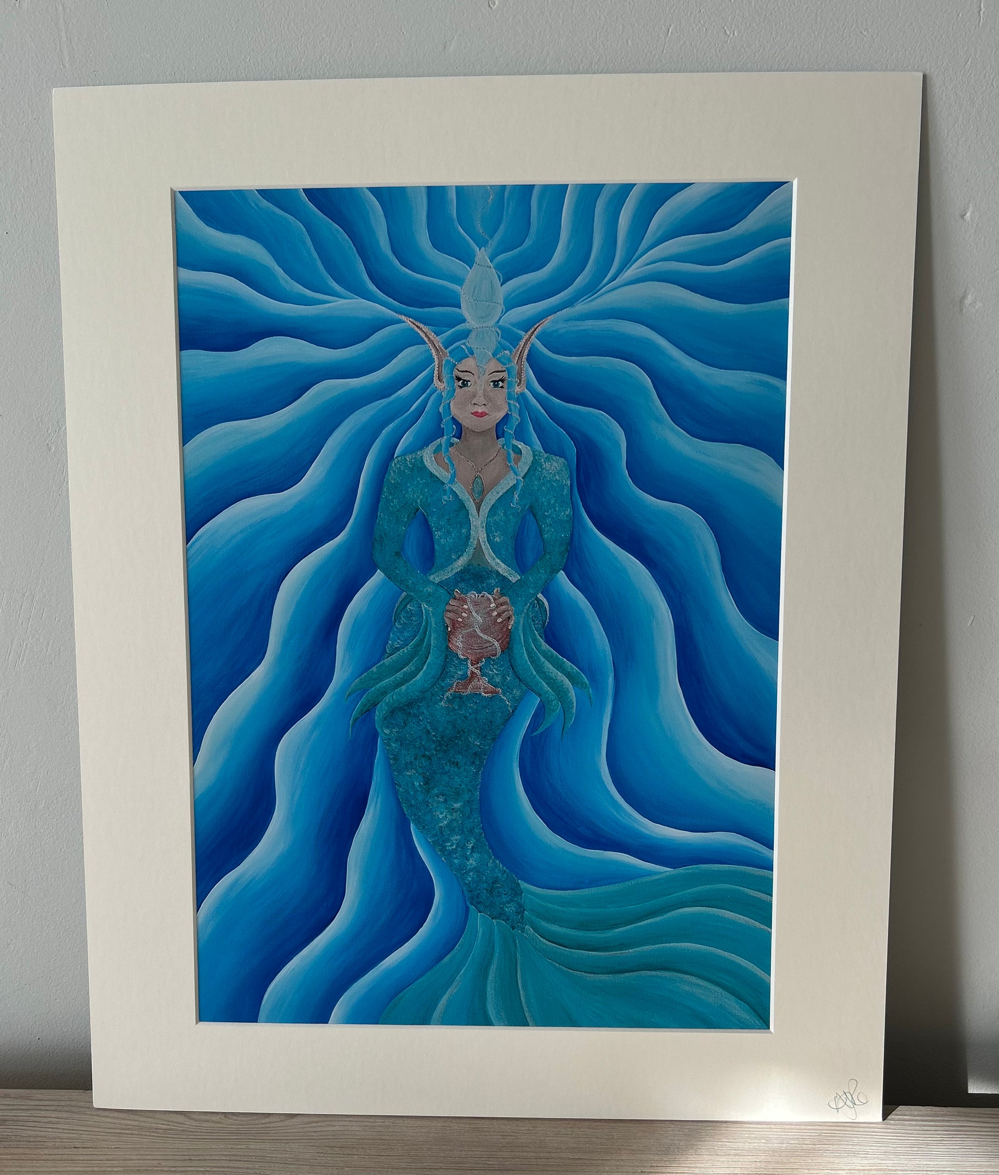 This beautiful water elemental came softly into be painted – Stunning aqua colours with swirls of the deep blue ocean appeared all around her – A very gentle energy, so soft with a shyness about her – She was holding a golden goblet – Is it half full or half empty?